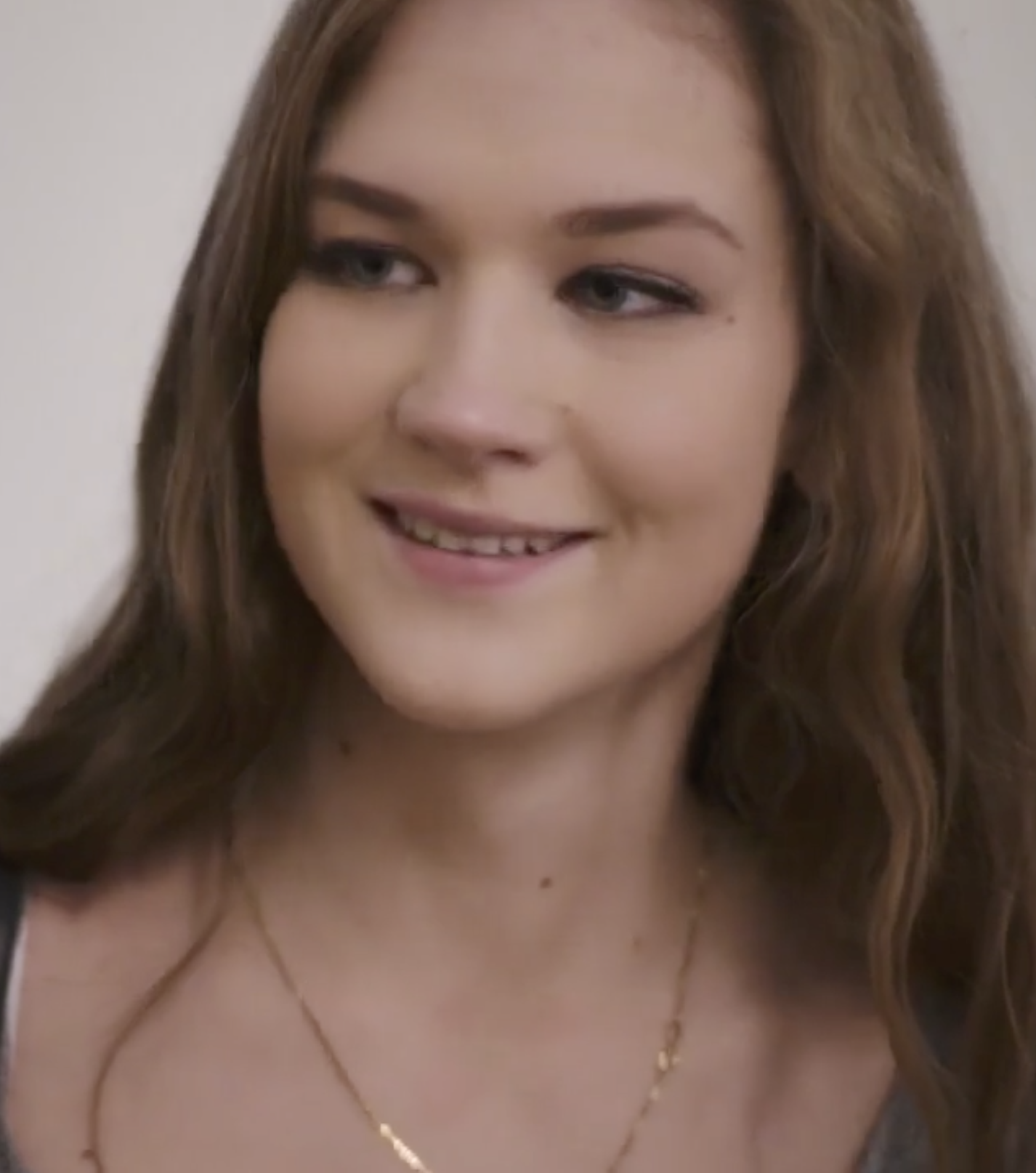 Симпатичная девушка со светло-каштановыми волосами, которые на свету становятся рыжими. У нее миловидное лицо и волнистые волосы.